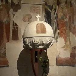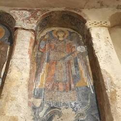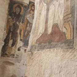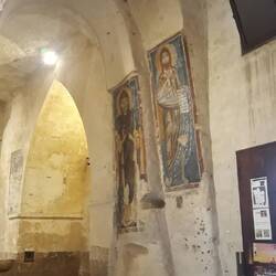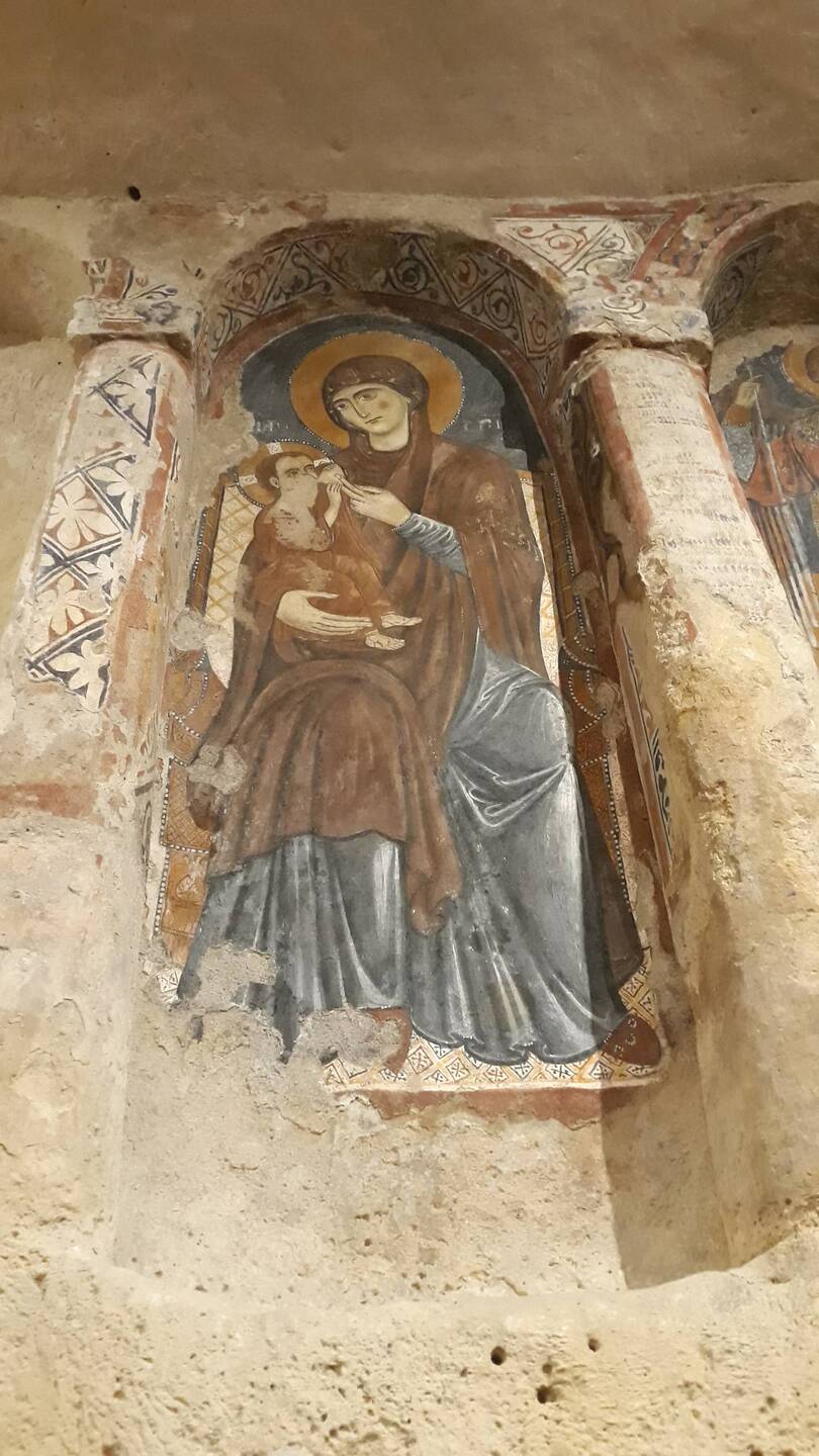 La prima delle due chiese è più usuale. È "edificata", non scavata o rupestre. La sua particolarità è l'affresco su soffitto ligneo.
