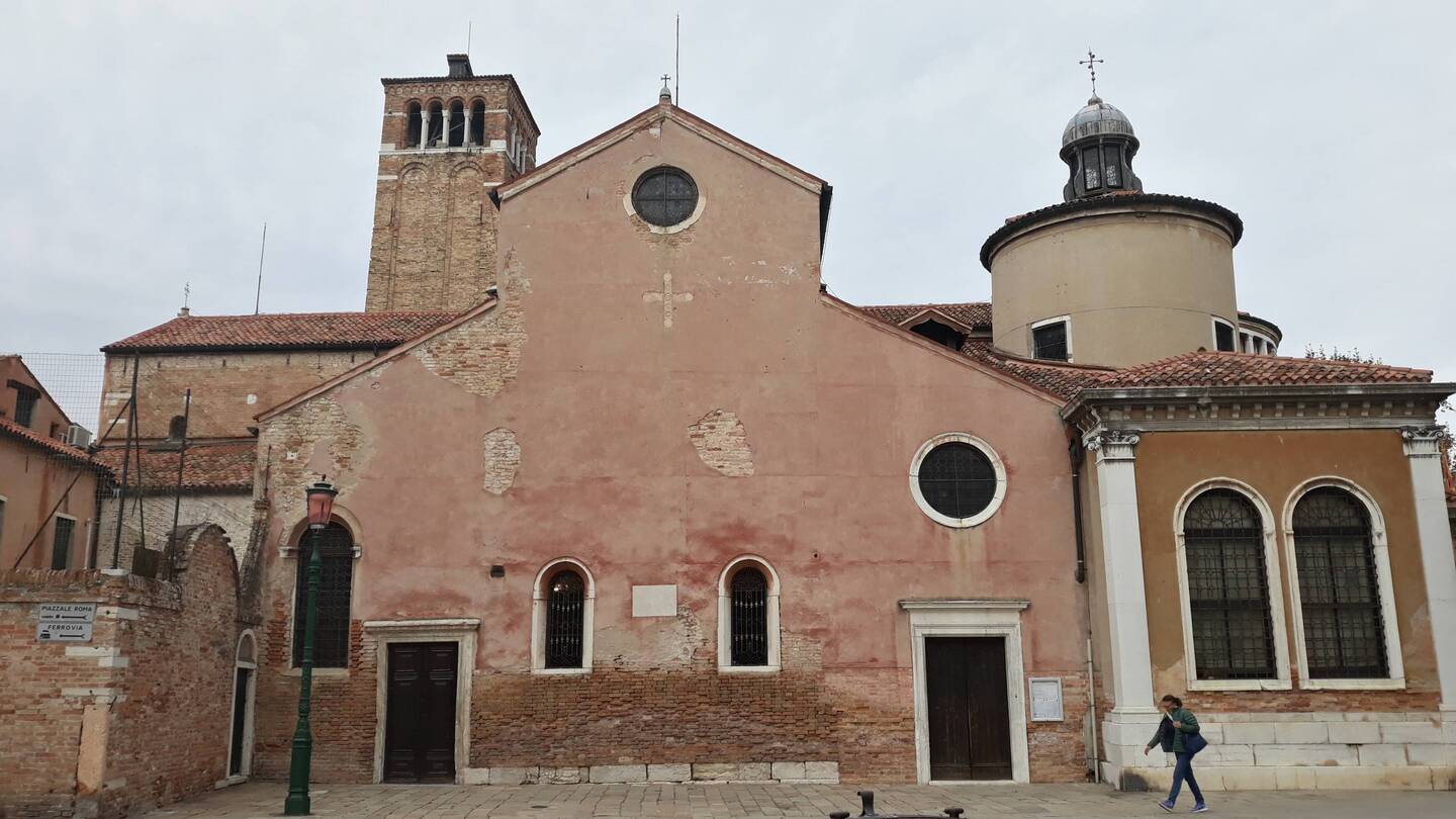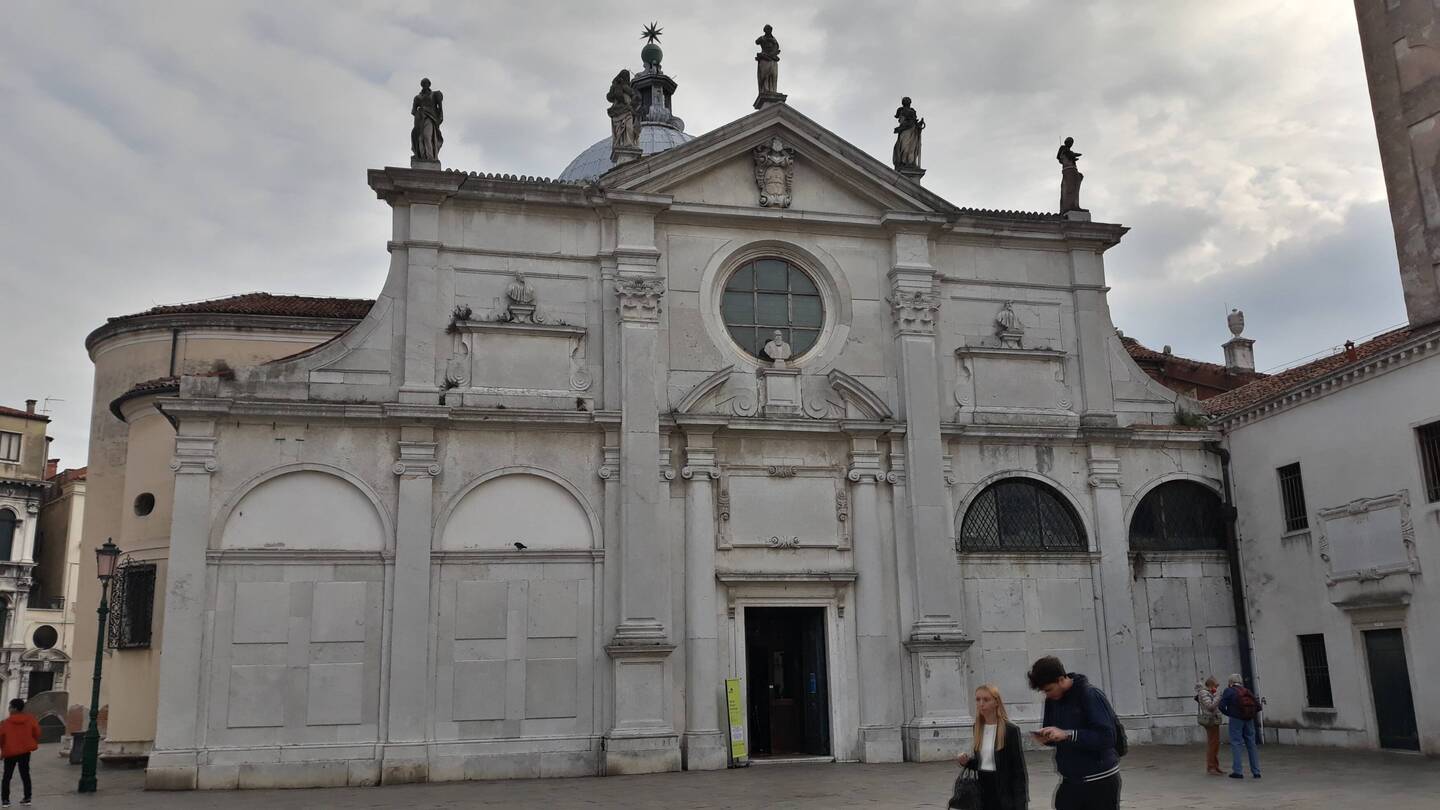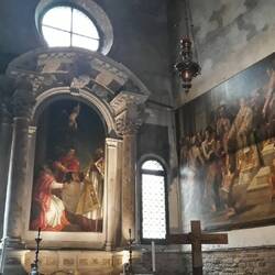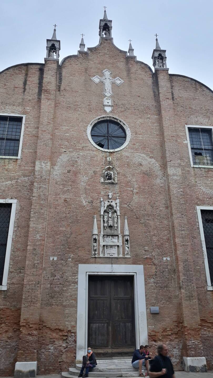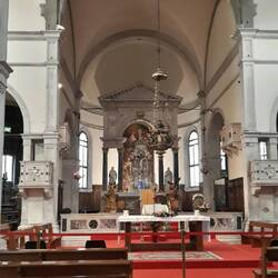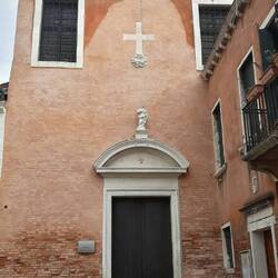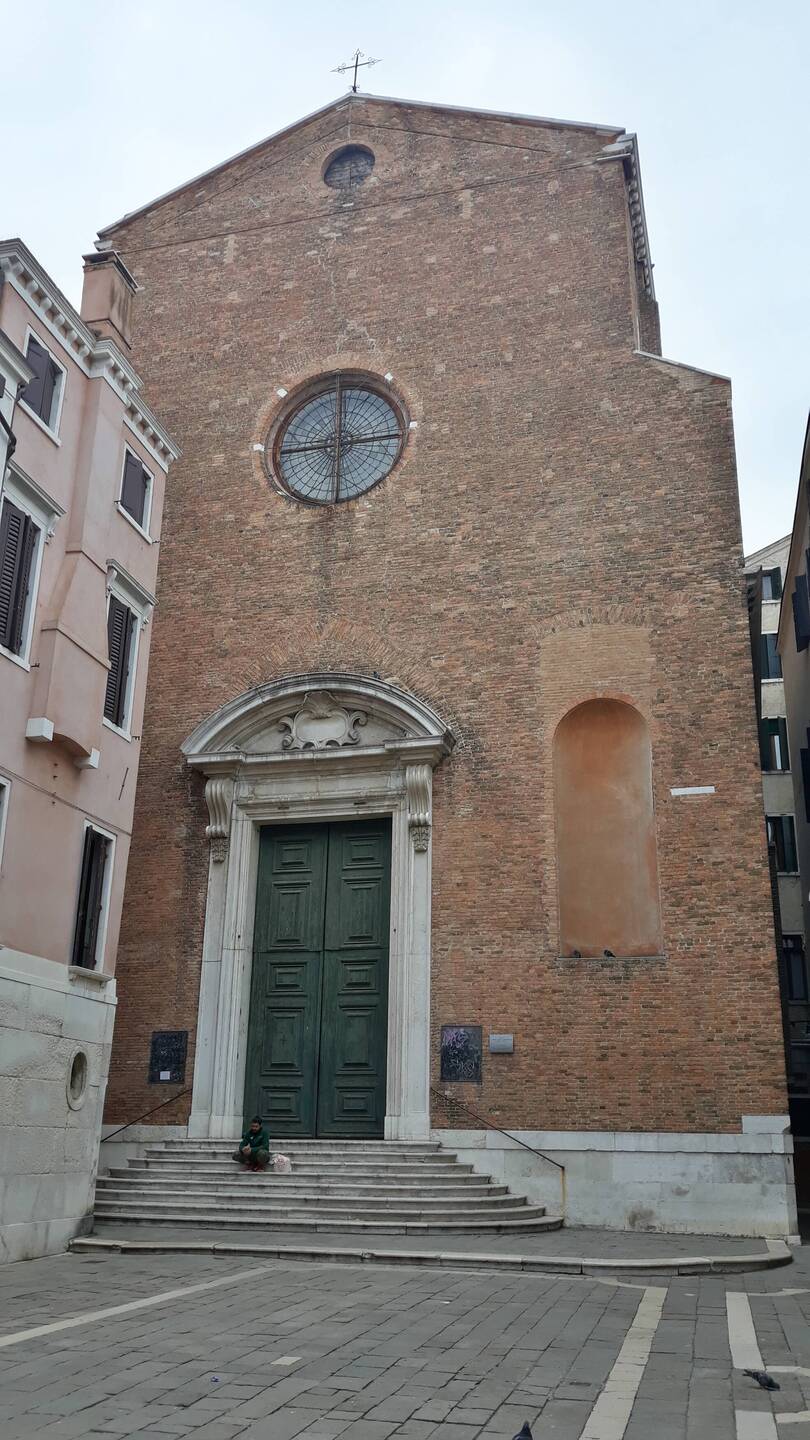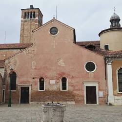 Chiesa senza facciata. All'interno una "Ultima cena" piuttosto movimentata di J. Tintoretto e, in un ambiente isolato, la via Crucis di Tiepolo.