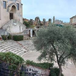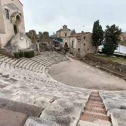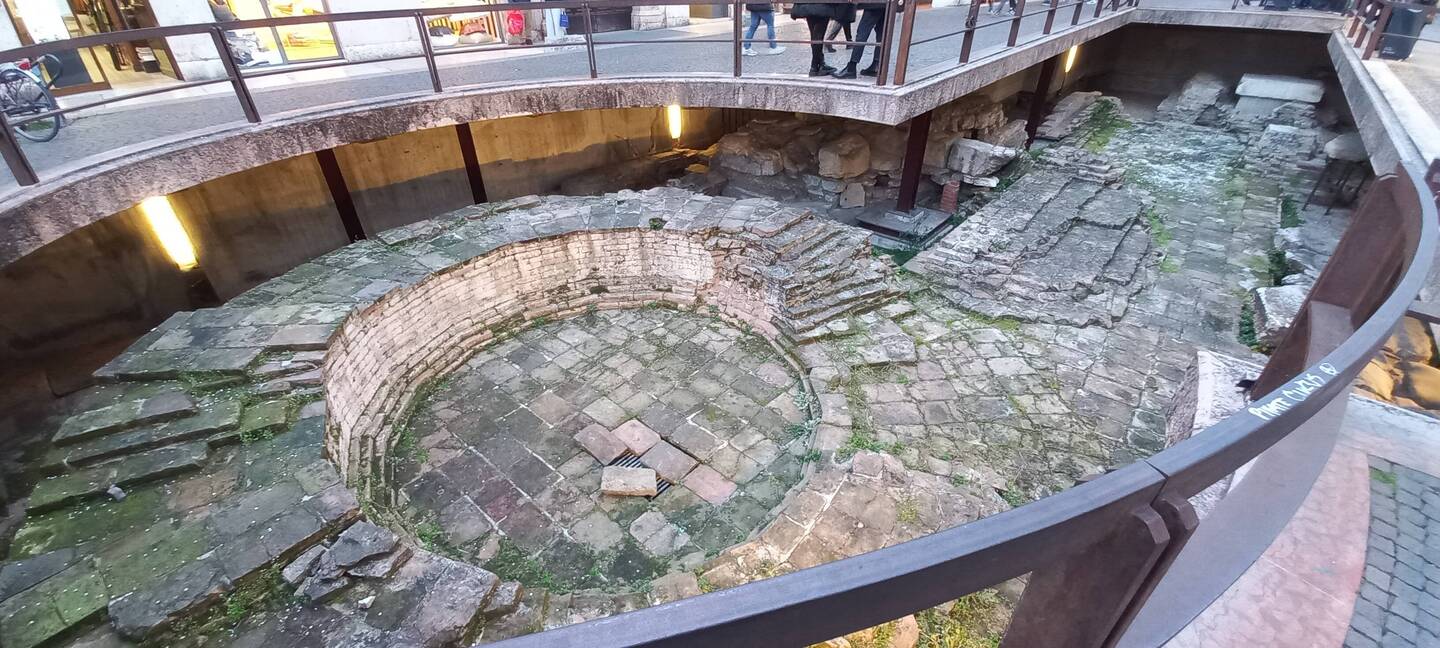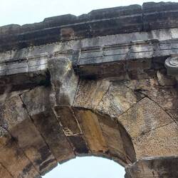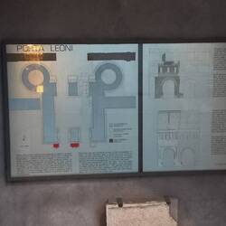 Porta delle mura romane, datata I secolo a.C., in cui si può notare un lato repubblicano e uno imperiale (cambia lo stile). Nella piazza, la base di una torretta.