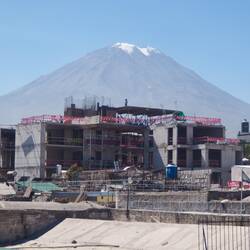 Die Tour ist gut besucht und wir ziehen mit einer Gruppe von ca. 20 Leuten um die Häuser Arequipas. Der Guide macht seine Arbeit anständig und ich erfahre eine ganze Menge über die Geschichte der Stadt, deren Stadtbild hauptsächlich durch den Einfluss der spanischen Eroberer geprägt ist: Katholische Kirchen, pompöse koloniale Gebäude und Plätze sowie geradlinige Gassen. Ich fühle mich ein wenig in die schönen spanischen Städte wie Valencia, Salamanka oder Barcelona versetzt. Interessant finde ich übrigens den Ursprung des Namens Arequipa. Dieser ist abgeleitet aus dem Quechua (die ursprüngliche Sprache der Inkas), und zwar von dem Wort „are quepay“, was soviel heißt wie „Ihr dürft bleiben“. Dies soll nämlich der damalige Inka-Herrscher den Spaniern mitgeteilt haben, als diese zu dieser Zeit noch „friedlich“ ins Gebiet des heutigen Arequipa einmarschiert sind. Hätte der Inka-Herrscher geahnt, dass die Spanier wenige Jahrzehnte später das größte südamerikanische Reich der Geschichte gewaltsam für sich beanspruchen, hätte die Stadt wohl heute anders geheißen 😉 Arequipa wird auch die weiße Stadt genannt, nicht nur wegen des hellen Vulkansteins, der die Gebäude erstrahlen lässt, sondern hauptsächlich auf Grund der Herkunft vieler Einwohner, die hauptsächlich aus europäischen Ländern und daher überwiegend weiße Hautfarbe tragen. So beschaulich und freundlich Arequipa wirkt, so sehr täuscht doch der friedvolle Eindruck, denn die Lage könnte geographisch kaum gefährlicher sein. Erbaut am Rand zweier tektonischer Platten wird es immer wieder von starken Erdbeben heimgesucht, das letzte katastrophale erst 2001 mit einer Stärke von knapp 8 auf der Richterskala. Nur die massive koloniale Bauweise mit schwerem Stein und stabilen Rundbögen konnte hier bisher eine vollständige Zerstörung der historischen Gebäude verhindern. Zudem ist Arequipa umringt von drei der größten Vulkane Perus, davon einer noch aktiv. Der letzte große Ausbruch ist erst 250 Jahre her. Wer weiß also, wann dieses Pulverfass mal wieder richtig explodieren wird? Die Gefahr aber mal außer Acht gelassen, verschaffen die Vulkane auf der anderen Seite Arequipa gerade erst diesen einmaligen Ausblick im Hintergrund in nahezu alle Himmelsrichtungen. Schönheit und Gefahr liegen doch manchmal so eng beieinander 🙂