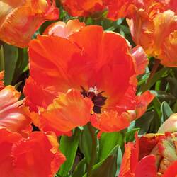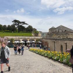 Die Wege wurden von Bäumen gesäumt, die entweder weiß, rosa-weiß oder rot blühten, vor allem die japanische 🌸 Kirsche war dominierend. Gepflegter Rasen und in diesen hinein Frühblüher gelegt. Traubenhyazinten, Narzissen, Osterglocken, Tulpen. Gepflanzt im bunten Mix, hoch-tief Variationen, ähnliche Farbtöne, Kontrastfarben, bodendeckende Tulpen und gigantische Vaiationen.