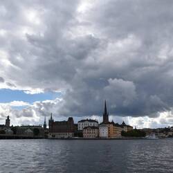 Am Anleger des imposanten Stockholmer Rathauses warten wir bei dramatischer Wolkenkulisse auf das Schiff zum Königlichen Schloss Drottningholm.