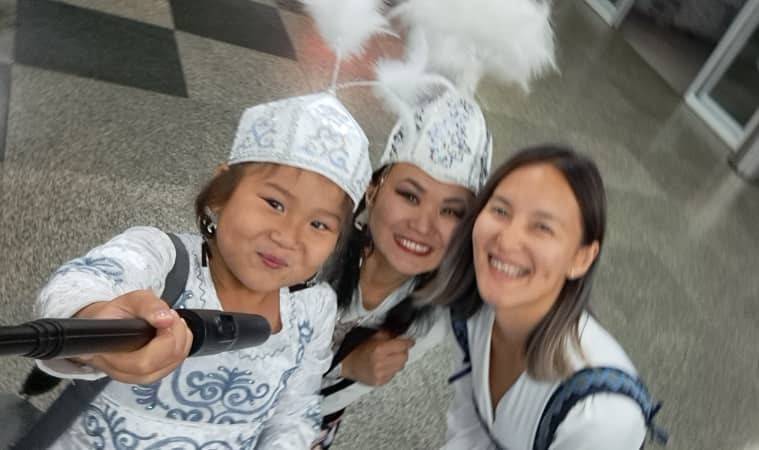 Wurden am Flughafen von Kanyshai, Butunya und Aichurok in tollen Trachten empfangen.