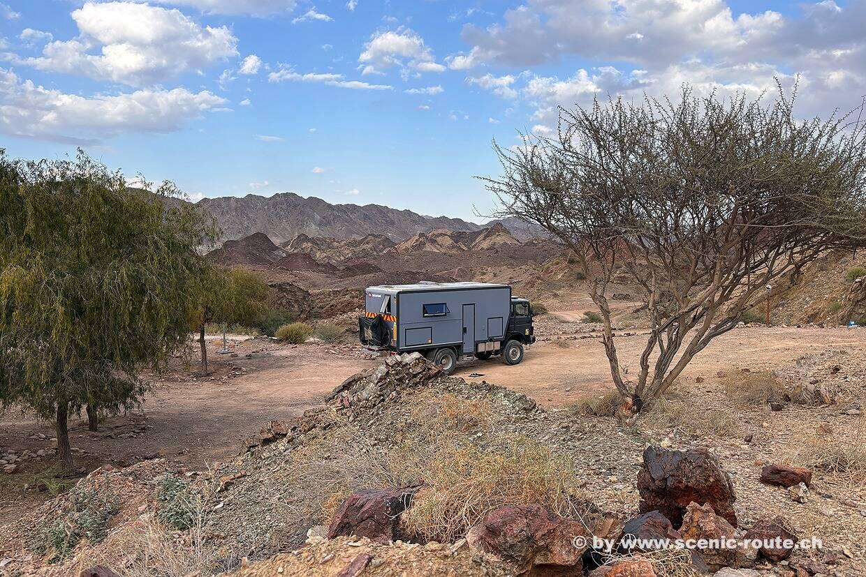 Stellplatz auf dem öffentlichen Gratiscamping auf einem Hügel in Hatta kurz vor der omanischen Grenze gefunden. Wunderbare Anlage, Platz mit Aussicht, See und arabischen Oryx im Gehege.