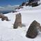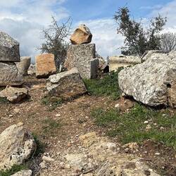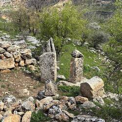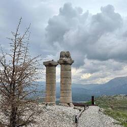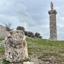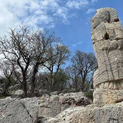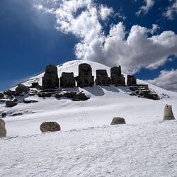 Fahrt zum Grabhügel Karakuş. Wurde mit Aussicht auf den Nemrut Daği vor Christi Geburt erstellt. Von sechs Pfeilern stehen nur noch vier, nur Frauen wurden hier begraben.