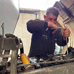 Seit Tagen leckt der Motor, wir zeigen das in Malatya in einer Garage. Zuerst gibts Frühstück, dann wird gearbeitet. Ob der Fehler ganz behoben ist, werden wir in den nächsten Tagen sehen.
