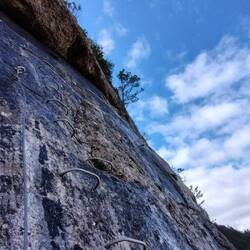 Auch wenn der Himmel blau war, war es doch ziemlich frisch! Die Wand liegt im Schatten und es pfeift ein eisiger wind.