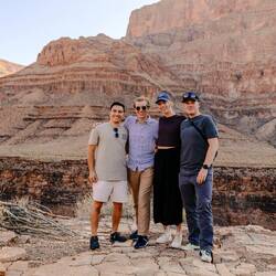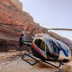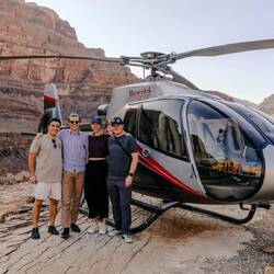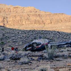 Den Flug starteten wir mit einem Überflug vom Flughafen von Las Vegas. Der Helikopter musste auf eine Höhe aufsteigen, sodass wir höher als die ankommenden Flieger sind. Es bot sich bereits jetzt eine tolle Aussicht über den Las Vegas Strip. Danach ging es weiter zum Hoover Damm. Bereits vor dem Damm sahen wir den grossen Stausee. Ein gewaltiges Bauwerk! Es ging weiter in Richtung Grand Canion. Auf dem Weg dorthin überflogen wir verschiedenste Canions, was wir auch spürten. Jeweils wenn wir unter uns eine Kuppe oder Gesteinsfels hatten, schüttelte es den Helikopter wenig durch. Im Grand Canion landeten wir an einem Platz von Maverick Helikopter. Dort machten wir 20 Minuten Pause und hatten die Möglichkeit Fotos zu machen. Wir nutzen die Möglichkeit und schossen ein paar Gruppenfotos. Danach ging es mit dem Helikopter wieder aus dem Canion zu eine Zwischenlandeplatz. Dort wurden die Helikopter aufgetankt. Es ging dann weiter wieder Richtung Las Vegas. Auf dem Rückflug überflogen wir den Lake Mead und den Valley of Fire Nationalpark, bevor es über den Las Vegas Strip zurück zum Flughafen ging. Es war ein tolles Erlebnis!