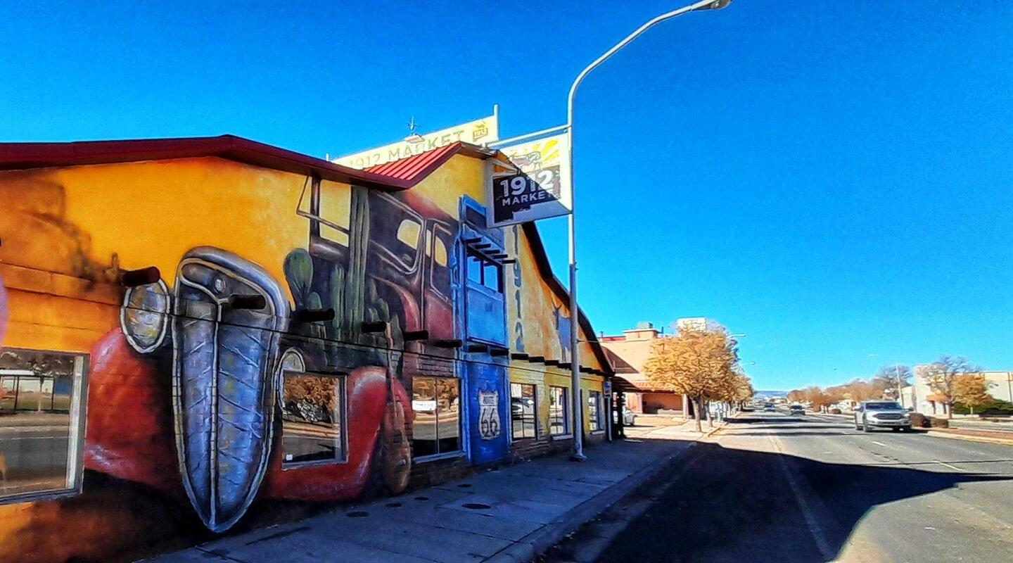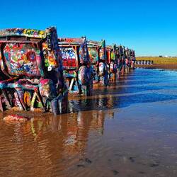 Visits to the Cadillac Ranch, mid point at Adrian, Tucumcari, Blue Hole and Santa Fe. Heavy snow a couple of days ago in Santa Fe.