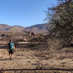Unser Zeltplatz ist diesmal ein Stein-Camp noch weiter draussen als im März. Ginsterkatzen huschen im Hintergrund druchs Geröll.