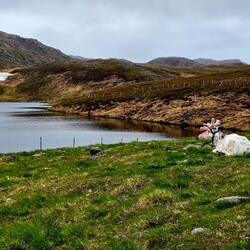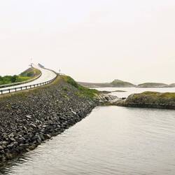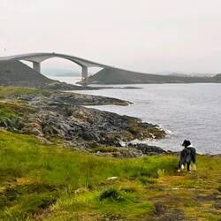La Atlantic Road est une route de 8.3 km qui relie plusieurs îles et défie le caractère aride des lieux. L'autobus parcourt une partie de la route puis revient sur ses pas pour notre première sortie. Une boucle de 5 minutes à pieds où 10 autocars ont déjà déversé leurs passengers. Deux toilettes nous attendent pour tout ce beau monde dont la pluie ne peut qu'avoir intensifié l'envie de pipi. Je vous laisses imaginer la file. Sinon, bon, une chance que quelqu'un a décidé de traîner son chien pour me permettre de faire une jolie photo.