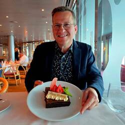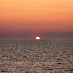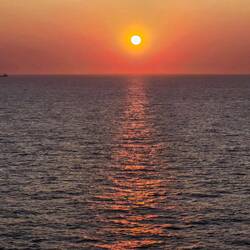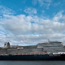 L'embarquement sur le bateau Nieuw Statendam se fait dans le bonheur. Comme on aime bien avoir un petit bonus, et qu'une première croisière avec une compagnie en offre peu, nous avons opté pour l'option Club Orange. Déjà, ça nous donne la priorité d'embarquement. Rapidement, nous sommes sur le bateau à profiter du beau soleil qui nous accompagnera pour le départ et durant toute la journée en mer du lundi. Ce sont les 56 ans d'Éric. Sa fête est soulignée dans le resto du Club Orange avec beaucoup de gentillesse. Le soleil se couche en demi cercle comme dans les dessins qu'on faisait, enfants.