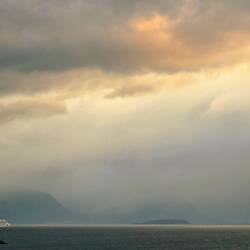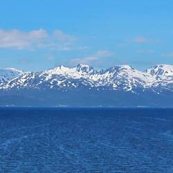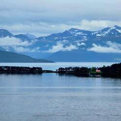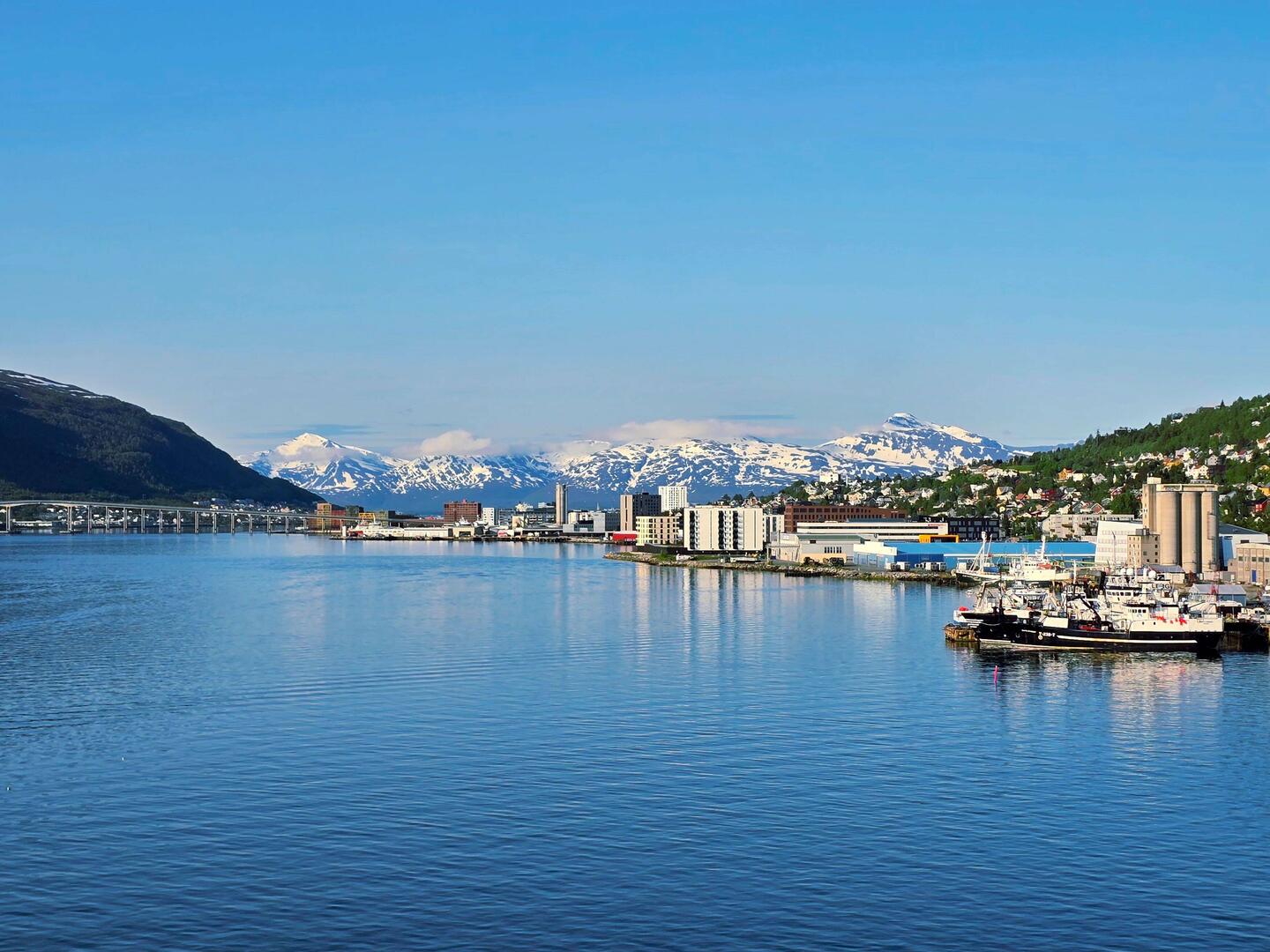 L'été est arrivé et ça se passe à Tromsø. Le soleil brille et il fait un solide 12 degrés. Quand j'écarte les rideaux de la cabine, je découvre un magnifique paysage de montagnes aux sommets encore enneigés.