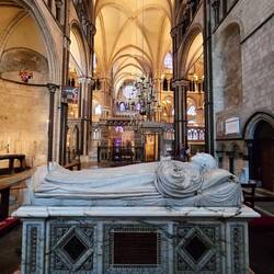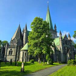 Je ne suis pas trop de bonne humeur (Éric ajouterait que c'est un euphémisme). La pluie me fige, je ne sais pas où aller. On trouve refuge à la cathédrale. Posée sur la tombe du roi de Norvège Saint Olaf, la cathédrale luthérienne de Nidaros remonte au 11e siècle. Y sont couronnés les rois de Norvège, c'est pourquoi dans le musée adjacent, on peut y voir les joyaux de la couronne (je mets des images trouvée sur internet, car les photos sont interdites).