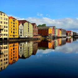 Quand nous sortons de la cathédrale, la pluie a arrêté. Le ciel bleu me redonne le goût de vivre! La course à la lumière se met en branle, ça ne durera pas! La Nidelva traverse un quartier du centre-ville et offre le plus beau des points de vue quand les anciens entrepôts sur pilotis, datant du 18e siècle, se mirent dans l'eau du fleuve anormalement calme, offrant une réflection presque parfaite. Je commence à m'habituer aux changements de ton de mère nature. Juste à temps avant que la pluie ne recommence, nous sirotons un petit flat white pendant que ça passe. La Norvège demande un peu de patience.
