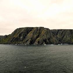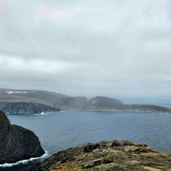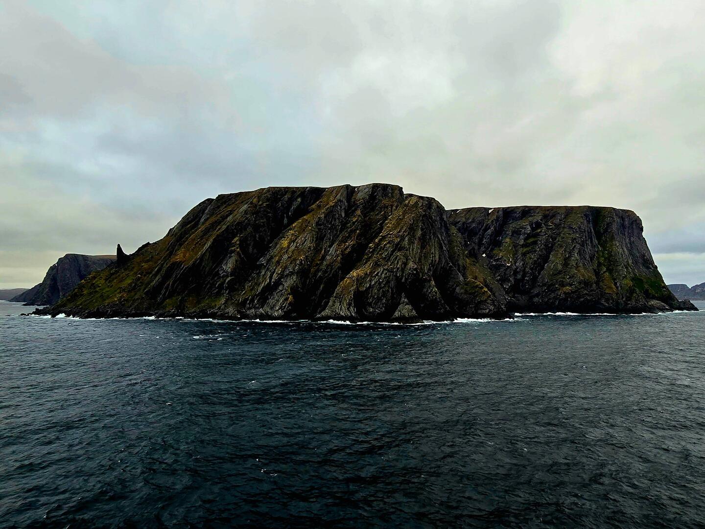 Le soir venu, après le souper, le programme annonce que le bateau va passer devant le cap nord vers 20h30. Je prends mon courage à deux mains, et je remets mes pelures pour affronter la froidure. Éric préfère écouter le trio classique. On est libre! Je ne m'attendais pas à ce que la falaise de 300 mètres soit si proche. Un face à face entre le cap nord, que j'en suis venu à personnifier comme l'emblème du froid, du gris et des nuages, et moi. À force de le regarder, j'en viens à le trouver beau, fort, impressionnant. J'oublie la grisaille et je vois la nature dans sa forme la plus brute, intransigeante, dure, injuste, merveilleuse. Je pense à ce qu'il faut être capable d'endurer pour se rendre jusqu'ici et voir, nez à nez, ce rocher qui ne bronche pas devant l'adversité des éléments qui se déchaînent. Quelle sorte de ressources doit-on posséder en soi pour accepter d'habiter une terre aussi inhospitalière?