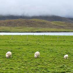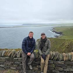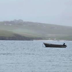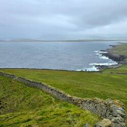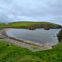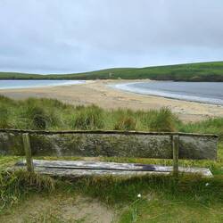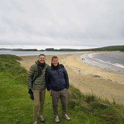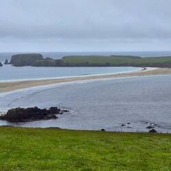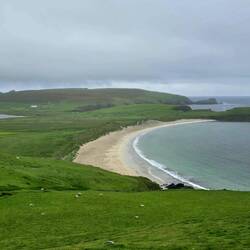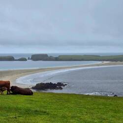 À la pointe nord de l'Écosse, Shetland est connue pour ses vestiges vikings qui remontent jusqu'à 850 ans avant Jésus-Christ. Théo sort un énorme téléscope pour nous permettre d'observer un broch (le broch de Mousa), le mieux préservé au monde, une tour de 13 mètres en pierres datant de 100 avant J.-C. Éric et moi, on connaît plutôt Shetland à cause de l'émission british du même nom, une série policière que nous apprécions particulièrement et qui exploite de belle façon la topographie de l'archipel. On reconnaît plusieurs lieux de tournage, la demeure du détective Jimmy Perez, la maison de la famille criminelle de l'île et la fameuse plage de St. Ninian, un tombolo, c'est-à-dire une bande de terre qui relie deux rives et n'est jamais recouverte par la marée.