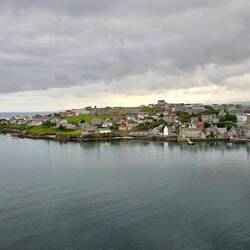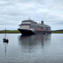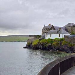 C'est tranquille le mardi matin dans la petite localité de Lerwick sur le reculé archipel de Shetland. Avec à peine 7 500 habitants dans la ville principale, et environ 23 000 au total dans les îles, on ne peut pas s'attendre à trouver un café ouvert à chaque coin de rue. Les quelques rues sont occupées par une poignée de passengers du Nieuw Statendam qui attendent des tours, comme nous. Un passenger prend une photo du bateau à partir d'un muret surplombant une petite plage. Il échappe son cellulaire dans le sable et la marée haute l'empêche d'accéder à la plage pour le récupérer. Un escalier descend dans 3 pieds d'eau. On rit. Une chance, un employé de la ville passait par là et a pu récupérer le cellulaire.