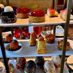 Vu notre intérêt limité, on fait la visite plus rapidement que prévu et je suis découragé à l'idée de devoir rester à Leith encore plusieurs heures pour notre tour de la distillerie à 15h. On se rend donc sur place pour devancer notre tour, puis on va prendre le thé au bateau-hôtel Fingal. Je pense qu'on peut y voir une thématique ici. Cet ancien bateau de 1963 a été acheté par le conseil d'administration du Britannia et complètement rénové pour le transformer en hôtel. Le afternoon tea, hors de prix avec le taux de change actuel, est excellent, mais j'ai depuis quelques jours attrapé un truc sur le bateau qui m'empêche d'en profiter pleinement. Je tousse beaucoup, malheureusement, et ça s'accompagne d'une envie de pipi chronique qui met la patience d'Éric à l'épreuve.