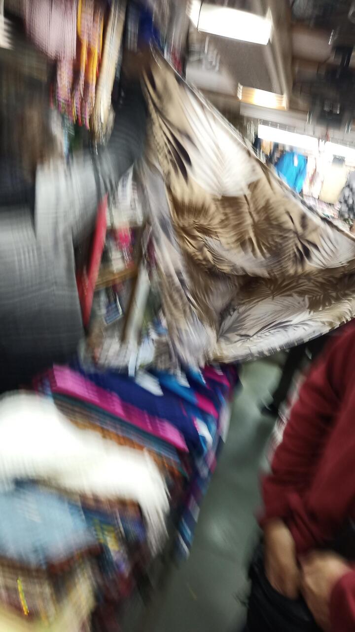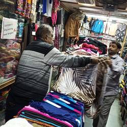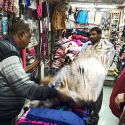 Shopping for a quilt in Mount Abu. We got a double size chungi quilt made locally.