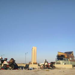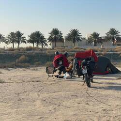 Next day, the bike was ready and we came around at the workshop where we met the owner, Jafar Behbehani. This guy is the main importer of BMW and Ducati in Kuwait and the first one bringing motorcycling to the Arabs, as he said - an energetic man in his 70ies, if not working or training, always on the bike. In his office he proudly showed us pictures of him together with George W. Bush and family, with Valentino Rossi, and other figures that shaped politics and motorsports. We went dinner together - touching ground, at the burger shop next door. Thankfully, Jafar gave us a very generous discount on the work, and we proudly signed on Ricki's personal wall of travellers he had helped out. With a healthily beating kismet (the carbs were so clogged, they told us, that the secondary carb barely delivered fuel...) and blinking as they cleaned both of our bikes, we headed out of town to camp close to the Saudi border.