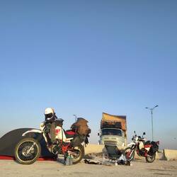 Once again, the first destination for us in Kuwait was a workshop to give Kismet a wellness treatment. She's been moody in the mornings and pissing oil all over, but nobody has to live with that and we went to the well renowned TriStar shop. And just as we arrived, RidingKismet cleaned the road from pointy things and brought them a punctured rear wheel. Ricki and Mohammed instantly started to punch us questions about Kismet's history and symptoms and said in two days everything could be solved. Alright! And indeed to their credit, next morning they sent us pictures and news of the engine, told us they had found the necessary seals and that the carb is being cleaned. Great service, guys, cheers!