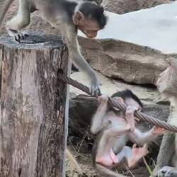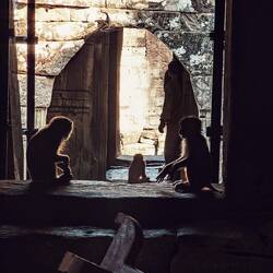 Auf dem Weg zum nächsten Tempel sahen wir endlich auch ein paar Affen am Straßenrand. Natürlich hielten wir an, machten Fotos und beobachteten sie eine Weile. Beim Bayon-Tempel, unserem nächsten Halt, gab es ebenfalls Affen – besonders zwei Babyaffen, die vor dem Tor spielten, waren ein Highlight. Der Bayon-Tempel selbst ist beeindruckend mit seinen zahlreichen Türmen, die alle Gesichter des buddhistischen Königs Jayavarman VII. tragen. Dieser König war einer der bedeutendsten in der Geschichte des Khmer-Reichs, da er die meisten Tempel erbauen ließ, darunter Angkor Thom, den Bayon-Tempel und viele weitere Bauten, die bis heute erhalten sind.
