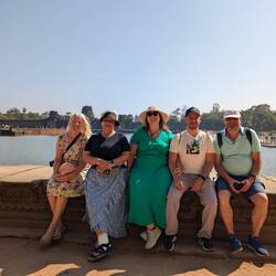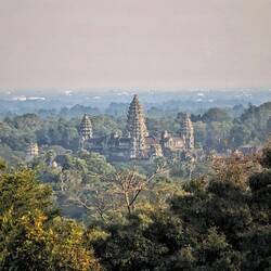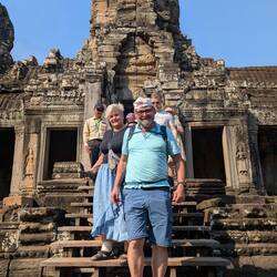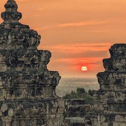 Nach einer kurzen Pause mit frischen Früchten und Getränken ging es dann weiter. Unser Ziel: ein Tempel auf einem Hügel, von dem aus wir den Sonnenuntergang beobachten wollten. Der Aufstieg war nicht besonders anstrengend, und oben angekommen war es – wie erwartet – ziemlich voll. Der Sonnenuntergang selbst war eher unspektakulär, aber der Blick von dort oben auf die Angkor-Anlage war absolut atemberaubend und machte die Mühe doch lohnenswert.