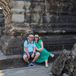 Unser erster Halt war der Haupttempel Angkor Wat selbst. Es war zwar ziemlich voll, aber die Menschenmassen verteilten sich schnell. Der Tempel ist riesig und beeindruckend, allerdings gab es außer im Inneren keinen Schatten – und die Sonne knallte. Unsere Tuk-Tuk-Fahrer waren unglaublich aufmerksam und boten uns nach jeder Besichtigung kalte Tücher und Wasser an. Das war Gold wert.