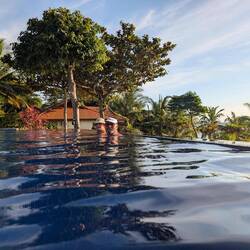 Anschließend aßen wir im Hotel zu Abend und zogen uns danach in unsere Hütten zurück. Dort wartete eine kleine Überraschung auf uns: ein Riesengecko. Alex versuchte, ihn hinauszuscheuchen, aber der Gecko war unglaublich flink und sprang von einer Ecke in die andere, bevor er sich schließlich hinter dem Schrank versteckte. Wir hoffen, dass er heute Nacht seinen Weg nach draußen findet.