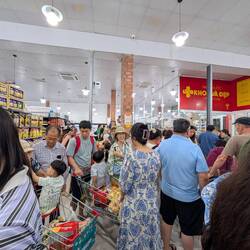 Der Supermarkt selbst war die reinste Hölle. Es war unfassbar voll – schlimmer als Weihnachtseinkäufe in jedem deutschen Supermarkt. Menschen unterschiedlichster Nationalitäten waren unterwegs, viele davon vermutlich Straßenhändler, die hier günstig einkauften, um die Ware später weiterzuverkaufen. Besonders Souvenirs wurden in Massen gekauft. Wir haben noch nie so einen überfüllten Laden gesehen.