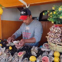 Spaziergang zum Strand🏖️ beginnt mit eine Runde Austern schlürfen 🦪🦪. Danach geht es weiter zum Fischkauf direkt beim Händler am Strand 🏖️. Man sucht den Fisch aus und zahlt, dannMeer informatie