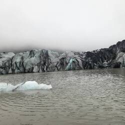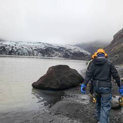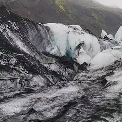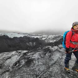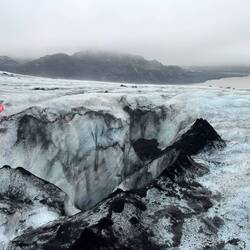 During the hike, we learnt a lot about the different appearances of the glacier throughout the hike. For example, we learnt about the black volcanic ash (from the nearby two volcanoes which are are due to erupt at any time) which when it is lightly spread makes the glacier melt faster but in other parts where it forms in large clumps/mountains/peaks/"trolls" (as per the name given by the Icelandic people), it slows down the melting process and preserves the ice. Ash also sits in the crevices of the ice and it was really cool to see the crevices of various sizes. Once a peak is formed, the wind/rain will move the ash into the new crevices and the process repeats itself. We were also able to inspect ‘sinkholes'/'moulins' (windmill in french) in the glacier. In a couple of areas, Sophie used an ice screw and hooking our harnesses onto a rope so we could walk right up to the edge of some of the moulins to try and see to the bottom - very cool! It felt like we were in a different planet and the conditions changed so quickly while we were up there (for example, one minute it was so misty you couldn't see down to the lake and the next it was clear). Gab also tried some volcanic clay on her face as a quick face mask which can also be found up the top!