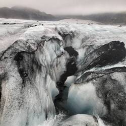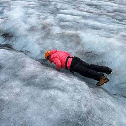 We arrived at base camp and were kitted up with waterproof pants, a harness, crampons (ice spikes for shoes) and an ice axe. We met our guide, Sophie, and were off to climb the Solheimajokull glacier! She taught us how to walk in our cramptoms - basically you stomp your feet into the ground and do high knee walking - basically, Daniel (who loves to stomp his feet even when walking "quietly") was born for this!! When you go downhill, you have to lean backwards and bend your knees which feels quite strange. We got used to this though and spent a good 2.5hrs around the glacier exploring.