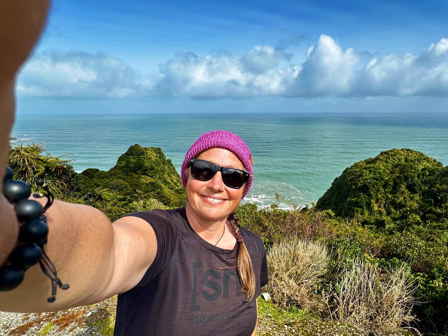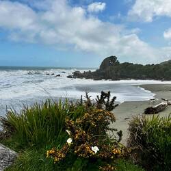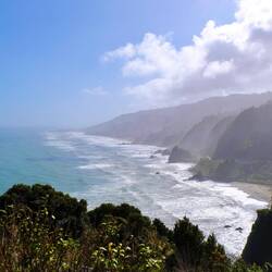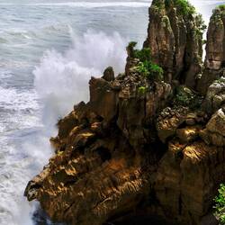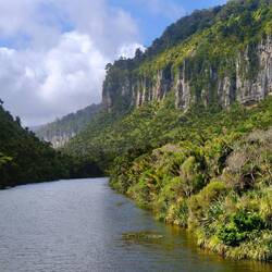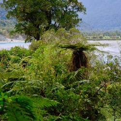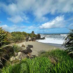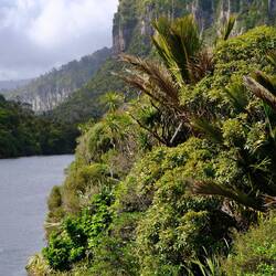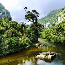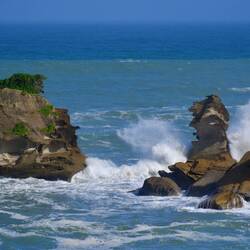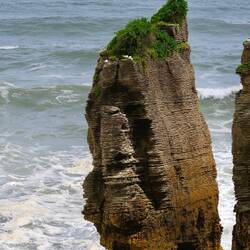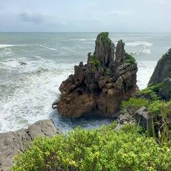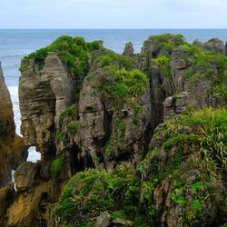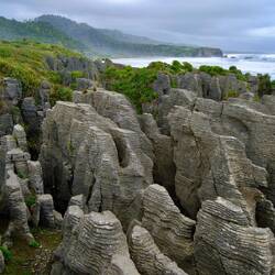 Wir fahren weiter den State Highway 6 Richtung Süden, immer an der Küste der Tasmanischen See entlang. Die Route ist bekannt für ihre landschaftliche Vielfalt (Küste, Berge, Regenwald, Gletscher). Wir stoppen oft, so viele schöne Ausblicke! Eine wilde Küste, hohe Wellen, Regenwald bis ans Wasser, alles grün. Als wir an der Mündung des Pororari Rivers vorbeifahren stoppen wir spontan, weil das Flusstal so schön aussieht, wir laufen ein Stück am Fluss entlang, auch hier wilde Vegetation, wunderschön. Auch die Pancake Rocks ein Stück weiter sind sehr beeindruckend: Die Felsen erinnern an aufeinander geschichtete Pfannkuchen.