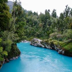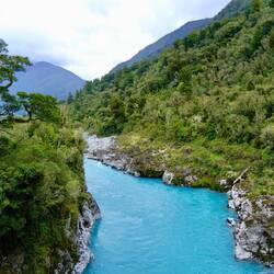 Wir fahren weiter bis Hokitika und zur gleichnamigen Schlucht, der Hokitika Gorge. eine Schlucht mit milchig-türkisfarbenem Wasser, das durch feinste Gletscher-Sedimente im Fluss entsteht. Umgeben von dichtem, grünem Regenwald und weißen Granitfelsen — ein toller Kontrast!