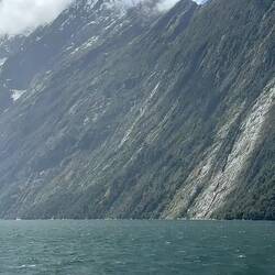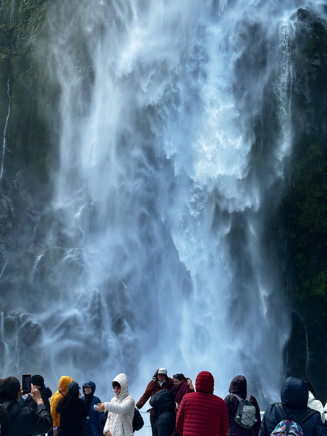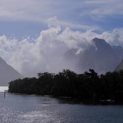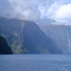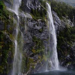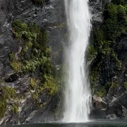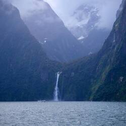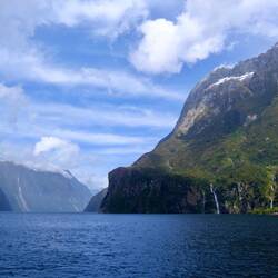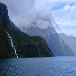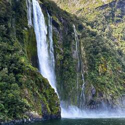 Der Sound (Unterschied Sound und Fjord: Fjord ist ein durch Gletscher während der Eiszeit geformtes, schmales, tiefes Flusstal, das nach dem Rückzug des Gletschers vom Meer überflutet wurde. Fjorde haben steile Felswände und sind oft sehr tief, wie der Milford Sound, also eigentlich der falsche Name. Marlborough Sound, durch das wir mit der Fähre auf die Südinsel kamen, ist ein richtiger Sound) erstreckt sich von der Tasmanischen See etwa 15 Kilometer ins Landesinnere. Er ist von steilen Felswänden flankiert wird, die bis zu 1.200 Meter und höher aufragen. Milford Sound ist für seinen außergewöhnlich hohen jährlichen Niederschlag bekannt – mit etwa 7000 mm/Jahr ist Milford Sound einer der regenreichsten Orte weltweit. Die häufigen und intensiven Regenfälle sorgen für Hunderte von temporären Wasserfällen entlang der Felsen; Lady Bowen Falls (165m) und Stirling Falls (155m) sind die einzigen beiden Wasserfälle, die ganzjährig fließen.