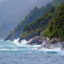 Die Sonne kommt durch, neben dunklen Wolken und Sturm, das Wetter ändert sich ständig. Der Kapitän hat Spaß, er fährt nah an die Wasserfälle heran, alle auf dem Deck werden nass! Wir fahren bis zur offenen See, drehen um, sehen Robben und ein paar Pinguine im Wasser, die waren aber schneller als mein Foto! Das ganze Fjord ist sehr beeindruckend, wahnsinnig hohe Felsen, sehr nass und wild! Toll!