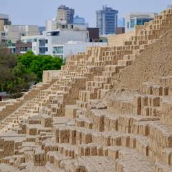 fahren mit dem Bus zur Huaca (Heiligtum) Pucllana, ist eine bedeutende archäologische Stätte, die im Stadtteil Miraflores liegt. Es handelt sich um eine große Pyramide aus Adobe** und Lehm, die aus sieben gestuften Plattformen besteht und als Zeremonial- und Verwaltungszentrum der Lima-Kultur diente, die zwischen 200 und 700 n. Chr. an der zentralen Küste Perus lebte. Die Pyramide sowie der umliegende Komplex zeigen die fortschrittliche Baukunst der damaligen Gesellschaft, darunter eine erdbebensichere Bauweise mit Lehmziegeln.
