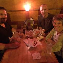 Having just watched Jurassic World at the dollar theater in Marietta, Gordon was attracted by the Pteradactyl burger. Matthew had the Ding Dong Chicken sandwich: chicken with peanut butter, sriracha hot sauce and honey cilantro slaw (!). Heather’s first glance at the menu landed on the “Southern Dog” and she could never quite get off it: topped with mustard, chili, swaw and onion. Gordon and Matthew had local beers which were lovely. Being designated driver, Heather rewarded herself with a side of red potato salad, which she swears is absolutely world class. Made with sour cream if she’s not mistaken, prompting the Wilson Nicoll memorial, “Why, at BONES you would pay $25.00 for that potato salad!” (Dollar amount appropriately inflated for passage of time.)