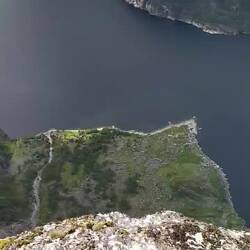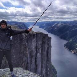 Der Regen hat aufgehört, zwar war es immer noch stark Windig, aber das war nicht so schlimm. Heute war gutes Wanderwetter mit einem Sonne/Wolken Mix. Wobei ich mittlerweile schon nicht mehr von Wandern sprechen würde, sondern fast schon von Bergsteigen 😅 Nach etwas mehr als einer Stunde kam ich an einer DNT Hütte vorbei und machte dort Frühstückspause. Dort war ein Paar aus Schweden, die wollten auch zum Kjeragbolten und waren gerade dabei zu packen. Ich traf sie später auf dem Weg zum Kjerag wieder. Am Kjerag angekommen waren dort auch schon etwas mehr Menschen, aber nicht so viele wie ich gedacht habe. Scheinbar habe ich einen guten Zeitpunkt erwischt. Ich musste nur ein oder zwei Minuten warten bis ich mich auf den Kjeragbolten stellen konnte um das berühmte Foto zu machen. Der Kjeragbolten ist ein ca. 5 m³ großer Monolith, der in einer Felsspalte 1000 Meter über dem Lysefjord eingeklemmt ist. Auch daneben gab es überall wundervolle Aussichten. Einige kleine Wasserfälle stürzten runter und ich konnte beobachten wie die dicken Wassertropfen nach oben geweht werden, schönes Phänomen. Vom Kjerag springen auch immer wieder Base Jumper. Seit 1994 gab es schon ungefähr 45.000 Sprünge. Hier kann man sich mal ein Paar ansehen: