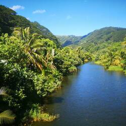 An der Westküste von Tahiti Nui halten wir noch an den Water Gardens Vaipahi und dem Mara'a Cave, wo es neben riesigem Bambus noch viele andere urige Bäume, einen Wasserfall und Teiche gibt. Anschließend geht es zurück nach Papeete, links immer wieder der traumhafte schwarze Sandtrand und rechts die mit Palmen und Bananenbäumen bedeckten Berge.