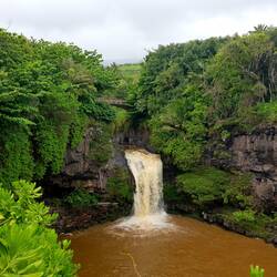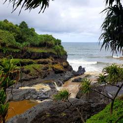 Im Wainapanapa State Park nur ein paar Meilen weiter, wollen wir eigentlich einen Coastal Hike machen. Nur leider ist der Wanderweg nach ein paar hundert Metern vorbei und wir finden einfach nicht heraus, wo es weiter gehen soll 😄. Also genießen wir noch etwas den Blick aufs Meer und fahren dann weiter 🤷🏻♀️ nach Kipahulu in den südlichen Teil des Haleakalā National Park. Wir machen zuerst eine nur 1 km lange Wanderung am Meer und Fluss entlang. Zum Glück endet der Wanderweg wieder an unserem Parkplatz, denn in diesen 15 Minuten wurden wir von den Mücken so sehr zerstochen, dass wir das die nächste Wanderung auf keine Fall ausgehalten hätten.