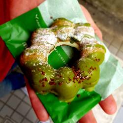 Zurück auf der Straße schauen wir uns noch etwas um und gönnen uns mehr Esskultur, um das mal sehr positiv zu beschreiben. Zuerst gibt es eine Art Donut, der mehr so aussieht als wäre er aus mehreren Poffertjes mit Verbindungsstücken zusammengesetzt worden, mit Farbe oder Matcha grün angemalt, aufgeschnitten und mit einer cremigen, aber geschmacklosen weißen Paste bestrichen worden. Mal etwas anderes, aber kein kulinarisches Highlight der Reise.