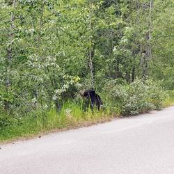 Heute gibt es nur eine kleine Wanderung am Rand des großen Nationalparks. Die Tour verläuft wieder einmal größtenteils im Wald, daher gibt es nicht sehr viel zu sehen. Auch Bären begegnen uns leider nicht. Wir sehen aber einen Braunbären und einen überraschend kleinen Schwarzbären aus der Ferne auf unserer Fahrt. Sie scheinen fast scheuer als die Rehe zu sein, von denen wir auch noch eines mit einem Kitz die Straße kreuzen sehen.