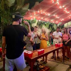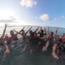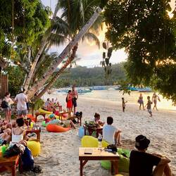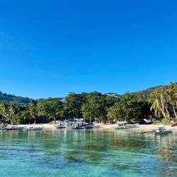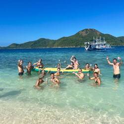 Die meisten Leute von unserer Keelooma-Bootsgruppe waren von El Nido ebenfalls nach Port Barton gereist. Juhu! Also planten wir am nächsten Tag einen gemeinsamen Bootstrip durch die kleinen Inselgruppen rund um St. Vincente. David konnte zwar nicht ins Wasser (ich nur bis zur Hand) aber wir entschieden uns dennoch mitzufahren. Es war einfach zu witzig mit all den tollen Leuten. Leider riss David's Pechsträne noch nicht ab. Die nächste Lebensmittelvergiftung sorgte für eine Nacht im Badezimmer und mit wenig Schlaf. Am nächsten Morgen musste er traurigerweise den Bootsausflug absagen. Er brauchte Ruhe und war erschöpft. Der arme Kerl. Das hatte wirklich niemand verdient! Also fuhr ich alleine mit. Vorbei an vielen schönen kleinen Inseln mit traumhaften Stränden, hielten wir zum Schnorcheln an verschieden Spots. Mittags gab es ein frisch zubereitetes Mittagessen direkt am Strand. Die Tour war eigentlich recht unspektakulär, aber die Energie der Gruppe war heute wieder großartig. Zum Sonnenuntergang stießen wir mit einem Piña Colada an. “¡Que puta vida!”, wie Pedro aus Argentinien sagen würde. Ich lief schnell zum Hotel zurück und überreichte David Banane und seine altbekannten Magen-Cracker. 45 Stück vertilgte er in einem Rutsch! Da hatte aber wieder jemand Hunger und ihm ging es zum Glück deutlich besser. Abends trafen wir uns mit allen im Hostel, unterhielten uns gut und spielten - wie es das Hostelklischee so will - Beerpong. Die Leute waren uns wirklich ans Herz gewachsen.