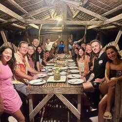 Gegen Abend ankerten wir vor einer kleinen Insel und gingen an Land. Unser Lager für die Nacht war ein traumhaftes Inselcamp aus Bambushütten zwischen Palmen und weichem Sand. Wir hatten das Camp ganz für uns alleine und die Stimmung war richtig gut. Nach einem heiß umkämpften Basketballmatch zwischen Inselbewohnern, Crew und den Touris, saßen wir am Strand und sangen zur Gitarre als der Vollmond am Horizont aufging. So ein Klischee - aber was soll's, es war toll. Auch das Essen war wieder fantastisch: frisches Gemüse, Fisch und Meeresfrüchte. Als dann noch ein Kanister mit billigem Rum-Cola zum selbst zapfen auf den Tisch gestellt wurde, kochte die Stimmung. Ich hatte so gehofft, dass wir eine coole Gruppe haben werden und wir lachten den ganzen Abend durch. Danke danke danke, dafür!