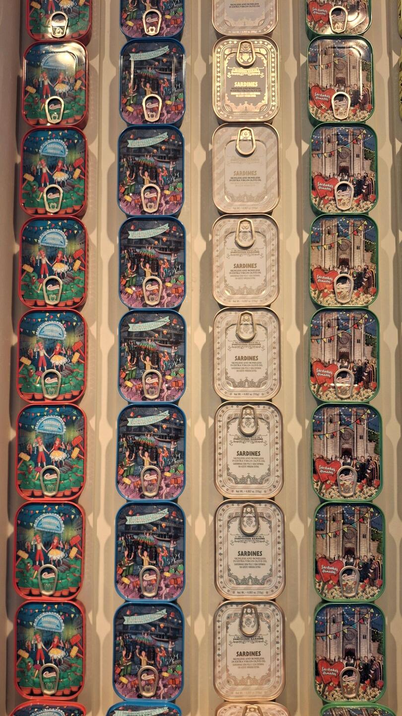 The shop is right next to the Igreja Matriz de São Sebastião in the old town of Ponta Delgada and they offer sardines, gilthead bream, mackerel, lean fish, trout, cod, smoked salmon, and cod roe, as well as mussels, whelks, and octopus... all in tins, each more colorful and imaginative than the last!