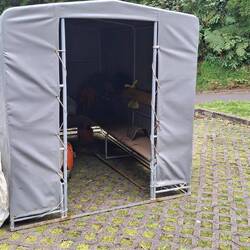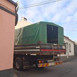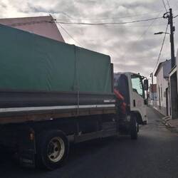 These tents are transported on the back of a truck. The truck picks up the workers as it makes its way through the village, and the small green tent sits on the back of the truck. The workers jump up and climb onto the back of the truck, into the small green tent.