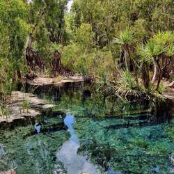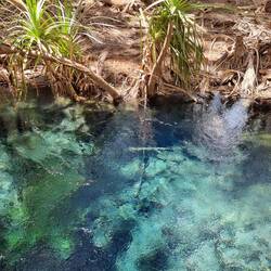 Zurück zu Mataranka: Der Ort an sich ist ein typisches kleines australisches Outback Ort an dem es wirklich nichts sehenswertes gibt und das Highlight die Tankstelle ist. Wir sind aber wegen den kristallklaren warmen Quellen hier. Vor allem die Bitter Springs sind einfach traumhaft. Ein paar hundert Meter kann man sich hier einfach treiben lassen. Hier haben wir auch einen längeren Zwischenstop eingelegt um nach der ganzen Fahrerei in den letzten Tagen etwas zu entspannen.